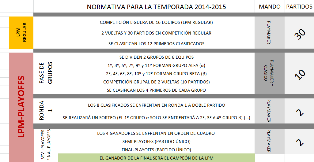 A partir de la temporada 2014/15 la LPM se divide en diversas fases: la LPM Regular, que consta de los 16 equipos que se enfrentan de manera directa hasta en 2 ocasiones, con un total de 30 partidos (esta fase se puede considerar como el posible primer título de la temporada, con permiso de La Supercopa que se disputa a mediados de agosto), los cuáles los 12 primeros clasificados pasan a los LPM-Playoffs o Playoffs de la LPM, donde se disputa una fase de grupos en dos agrupaciones entre éstos 12; a continuación, los 4 primeros de cada grupo se batirán mediante un SORTEO (Ronda 1), a partir de un sistema de combinaciones (el 1º del grupo A sólo se podrá enfrentar al 2º,3º o 4º del grupo B, y viceversa) a doble partido en un cuadro de fase final; los ganadores se enfrentarán según el cuadro (SEMI-PLAYOFFS) a partido único en un determinado estadio; los ganadores se batirán por el título final de LPM en ese mismo estadio (FINAL-PLAYOFFS) y se realizará la commemoración del Campeón de la LPM.